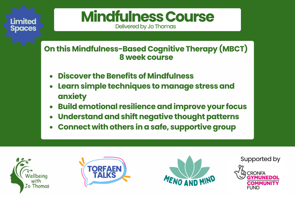 Join us at Panteg House, Griffithstown, for these relaxed 2-hour sessions as part of our 8-week MBCT (Mindfulness-Based Cognitive Therapy) course. In each session, we’ll explore practical mindfulness techniques to help reduce stress, improve focus, and support overall wellbeing.